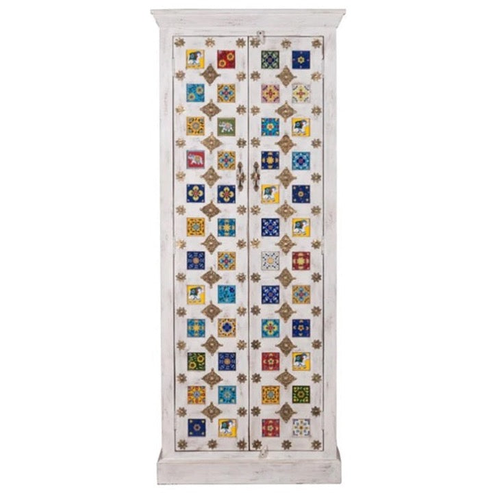 Our Cages almirah has sturdy mango wood construction & a multi colour tile door with brass fittings.