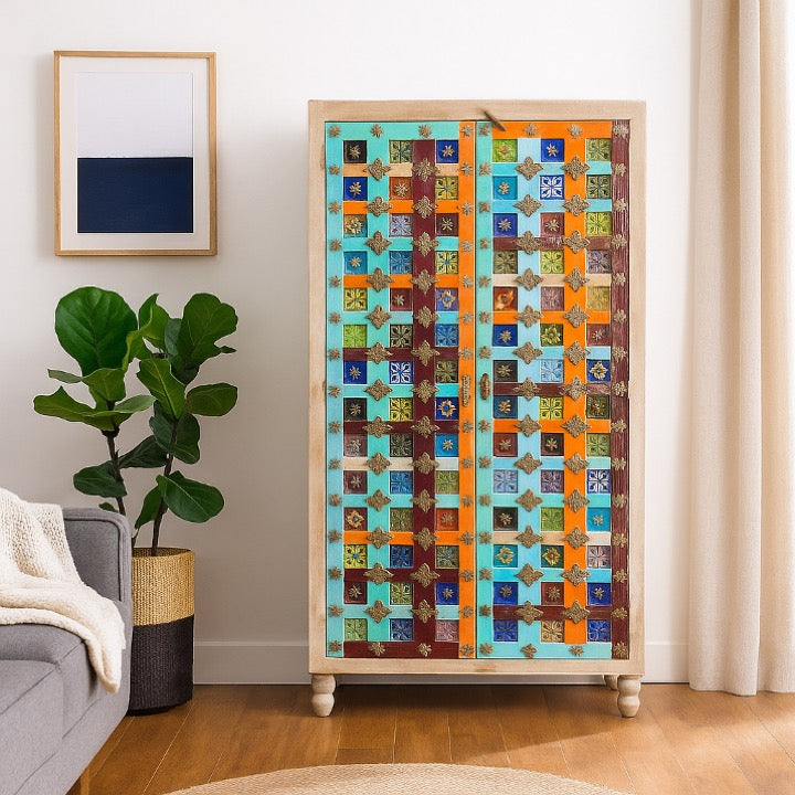 Our Cages almirah has sturdy mango wood construction & a multi colour tile door with brass fittings.