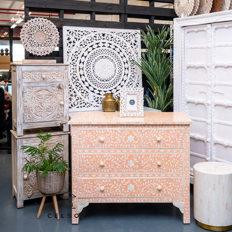 Set in a floral pattern & a lovely peach colour, this cabinet is a must have piece!