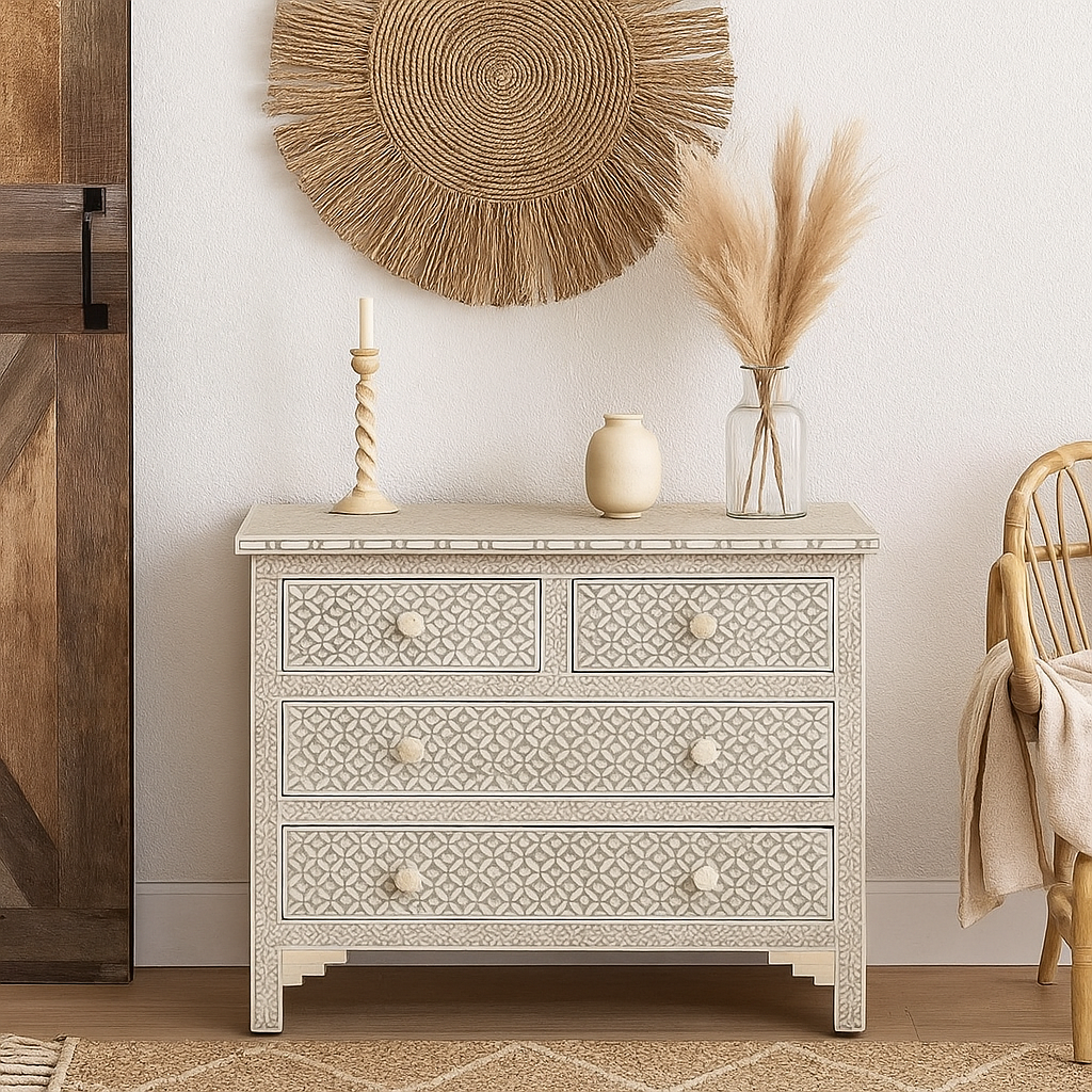 With its 4 drawers and gorgeous geometric pattern, this beauty can be used in the  bedroom to stores clothes & accessories or in the living room to store all your extra gadgets, books and stationery.