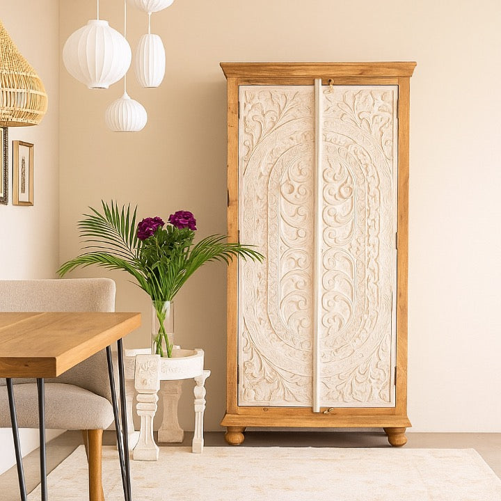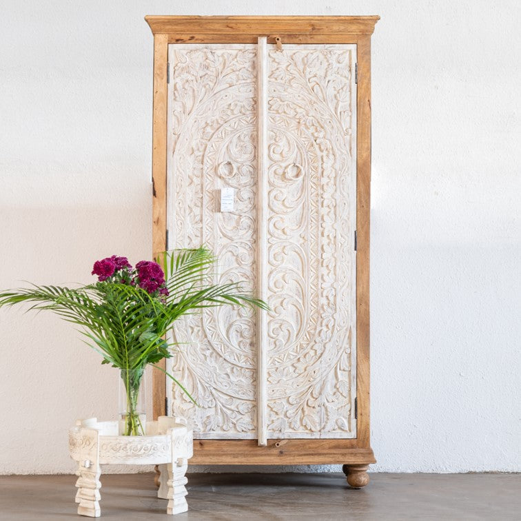 With a lovely white wash & natural finish, fully hand carved doors & ring like pulls, this piece is a keeper!