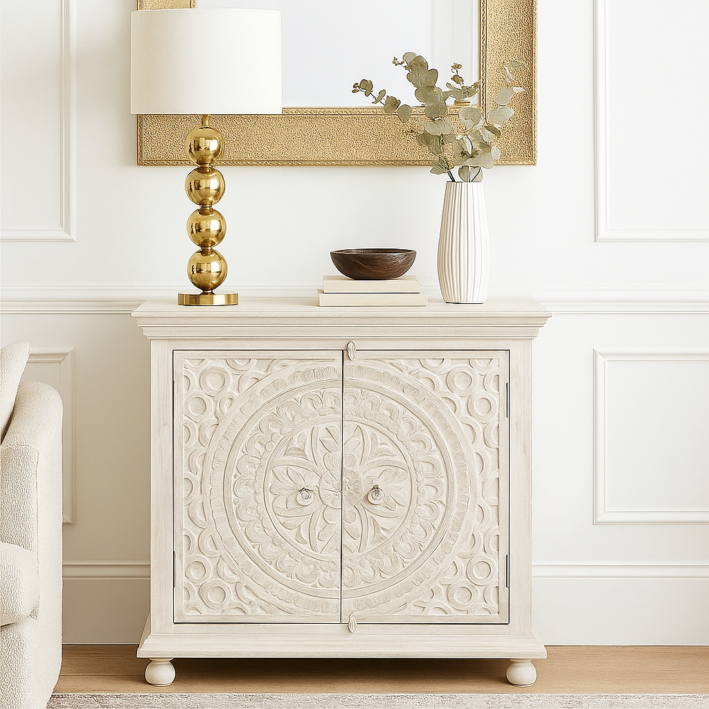 This hand carved beauty comes with two shelves inside and is perfect to store everyday bed & bath linen or be used as a kids toy’s storage.