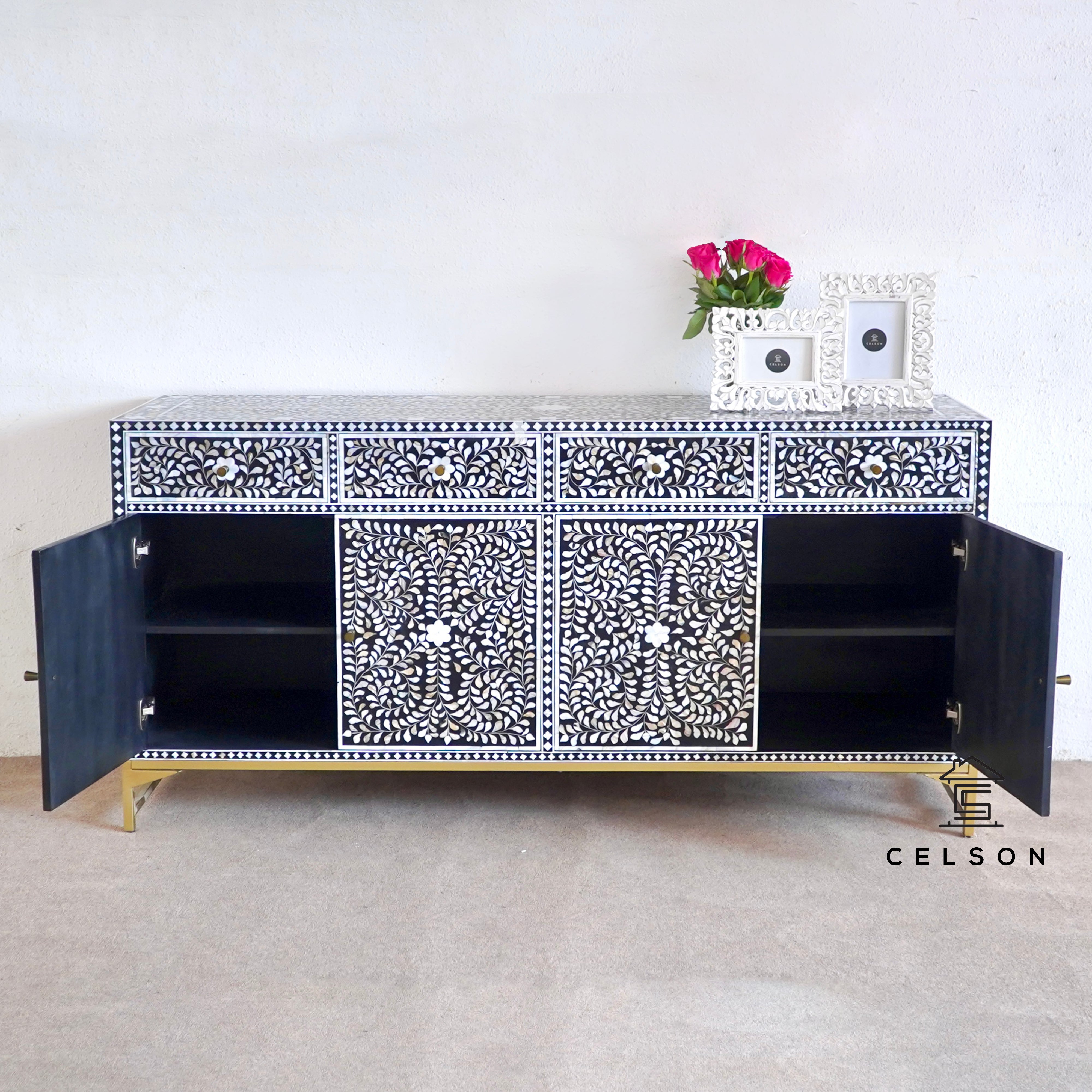 Our black MOP inlay sideboard adds elegance to any room with its floral design and golden base.