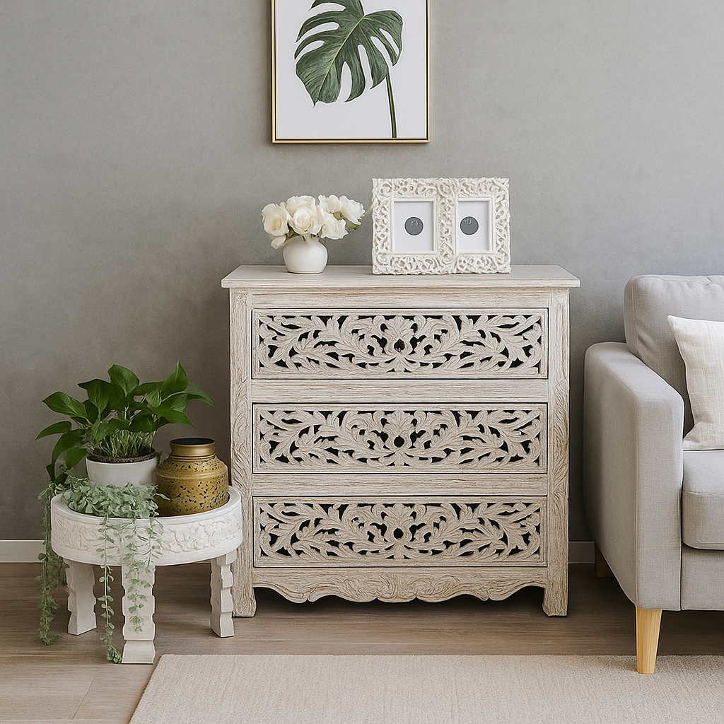 This hand carved beauty comes with three drawers and is perfect to store everyday bed & bath linen or be used as a kids toy’s storage.