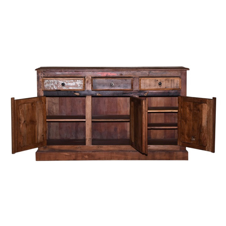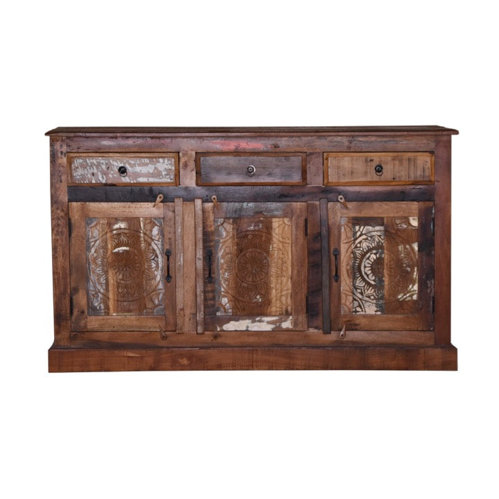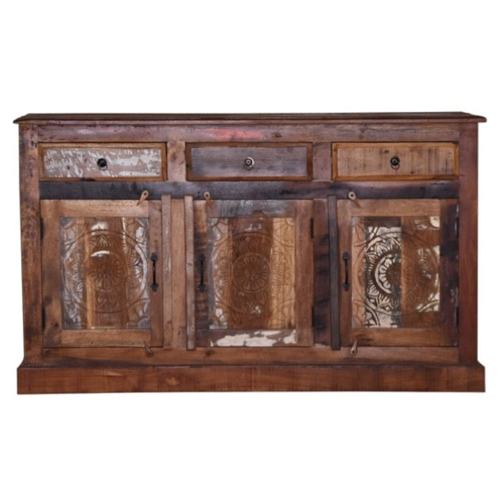 This sideboard is an absolute eye catcher with its hand carved design and complimenting metal pulls - all made from reclaimed wood!