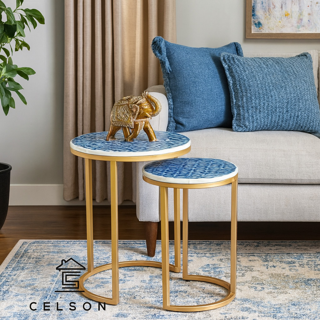 This set comes with Mother of Pearl inlay on the table top & gold legs to add a touch of boldness!
