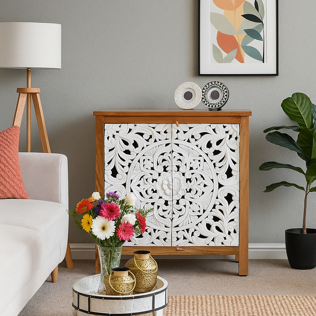 White distress isn’t just a color—it’s a statement! This hand-carved cabinet features stunning, intricate doors, complemented by natural wood color accents on the top, bottom, and sides. With an interior shelf for storage, it’s the perfect mix of beauty, function, and timeless charm."