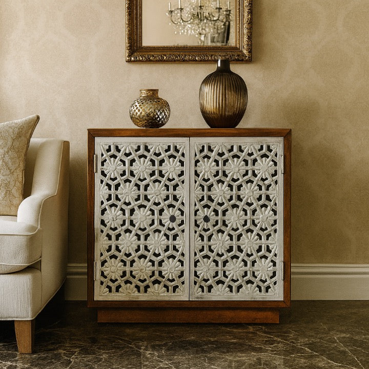 Hand carved with 1 shelve inside made from solid mango wood in the shape of delicate carving, this show-stopping storage piece has great interior space and it is ideal for living room entertainment, also can be used as an entryway piece.