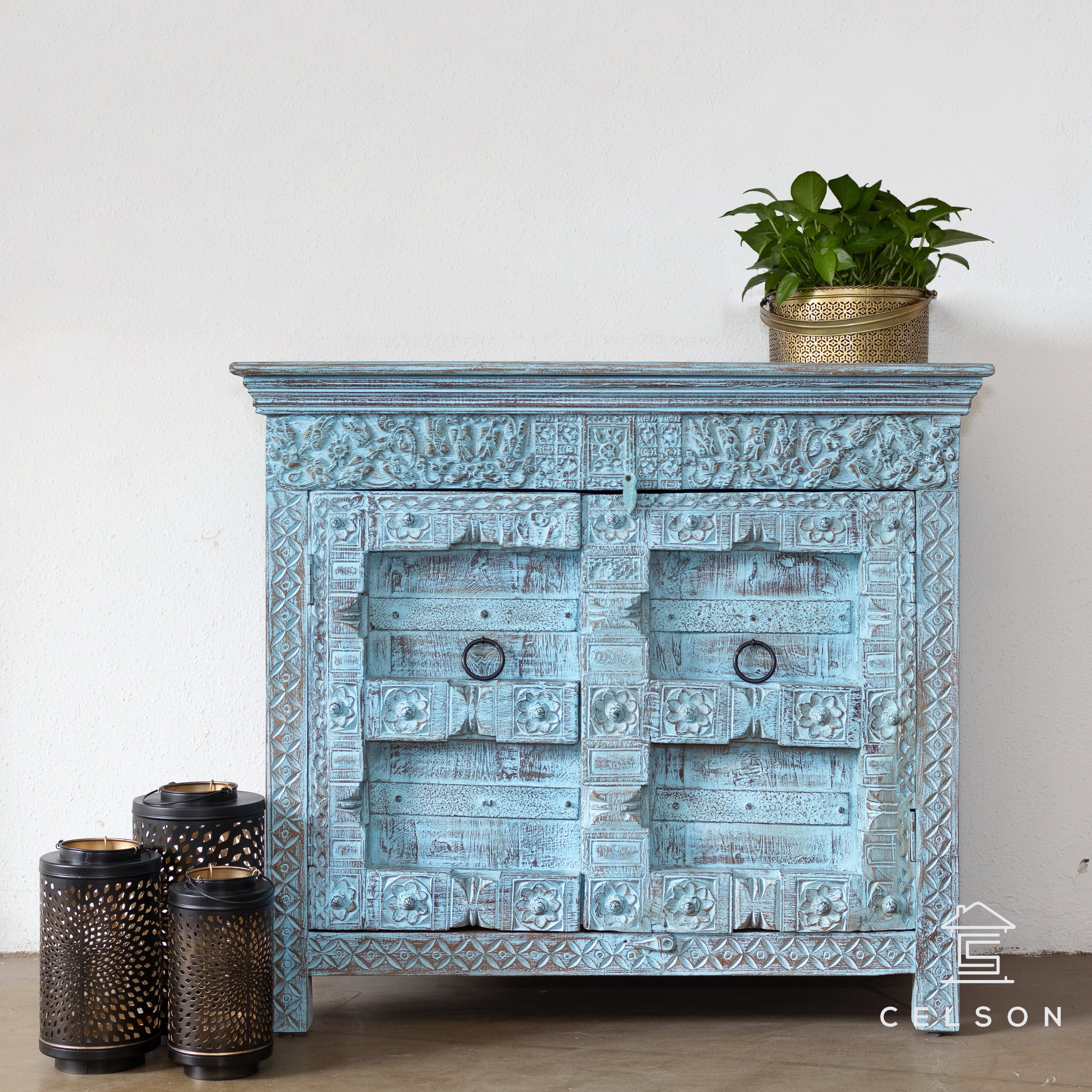 Rustic charm meets vibrant blue! This vintage reclaimed wood cabinet features hand-carved designs and metal pulls, with two doors that combine beauty and function.
