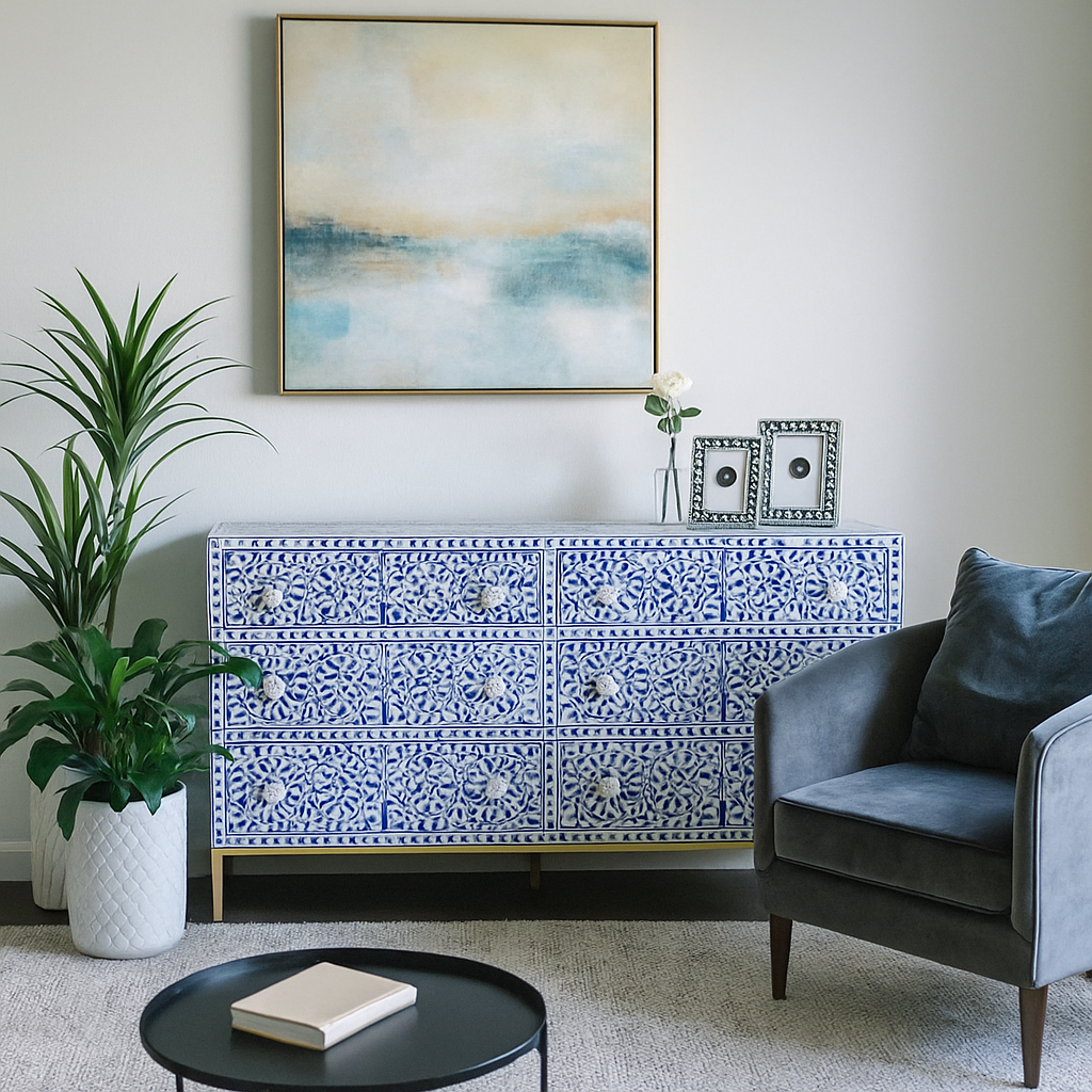 Where style meets function! This blue floral chest of drawers is the perfect blend of elegance and practicality. With 6 spacious drawers, luxurious bone knobs, and a sleek golden metal base, it’s designed to elevate any room with sophistication.