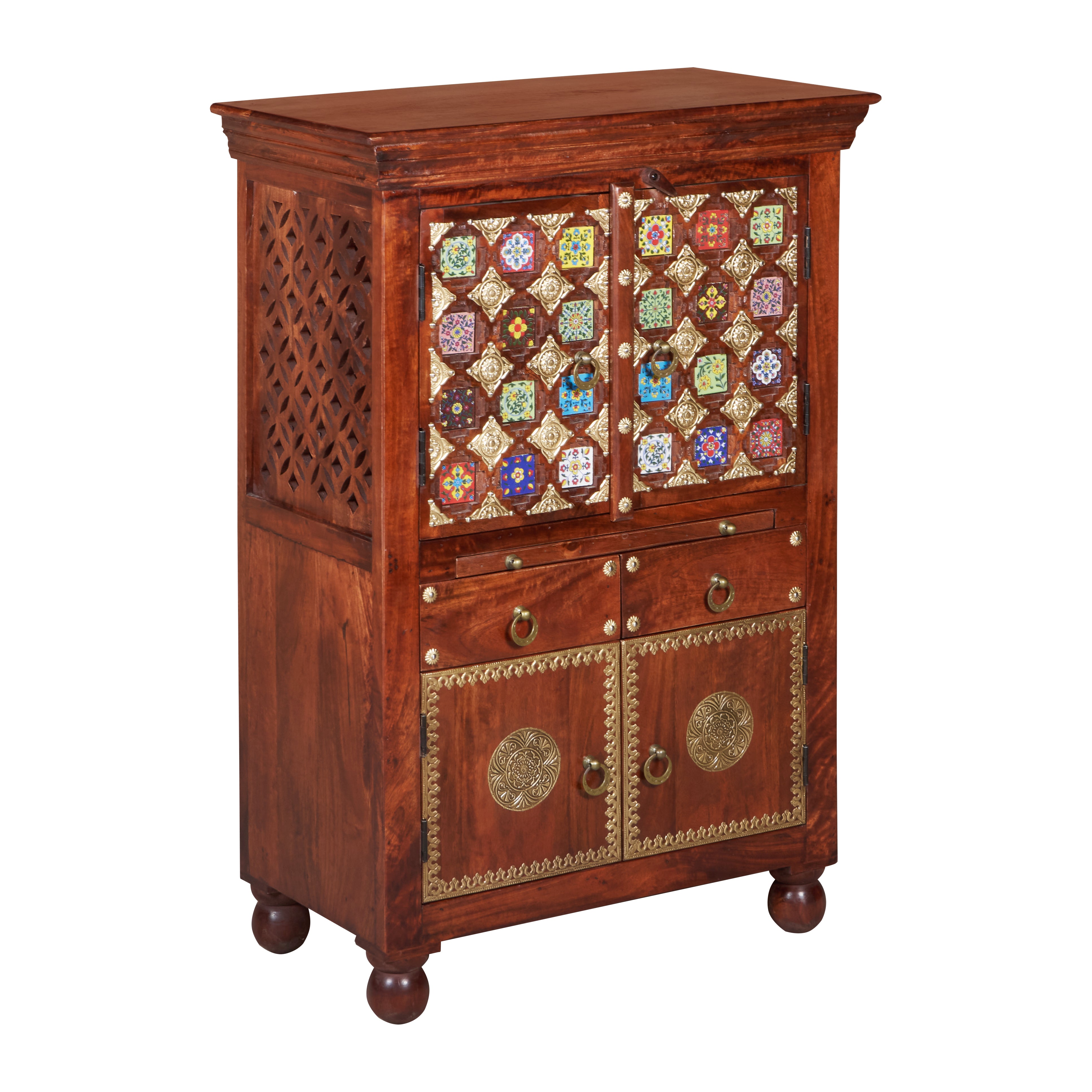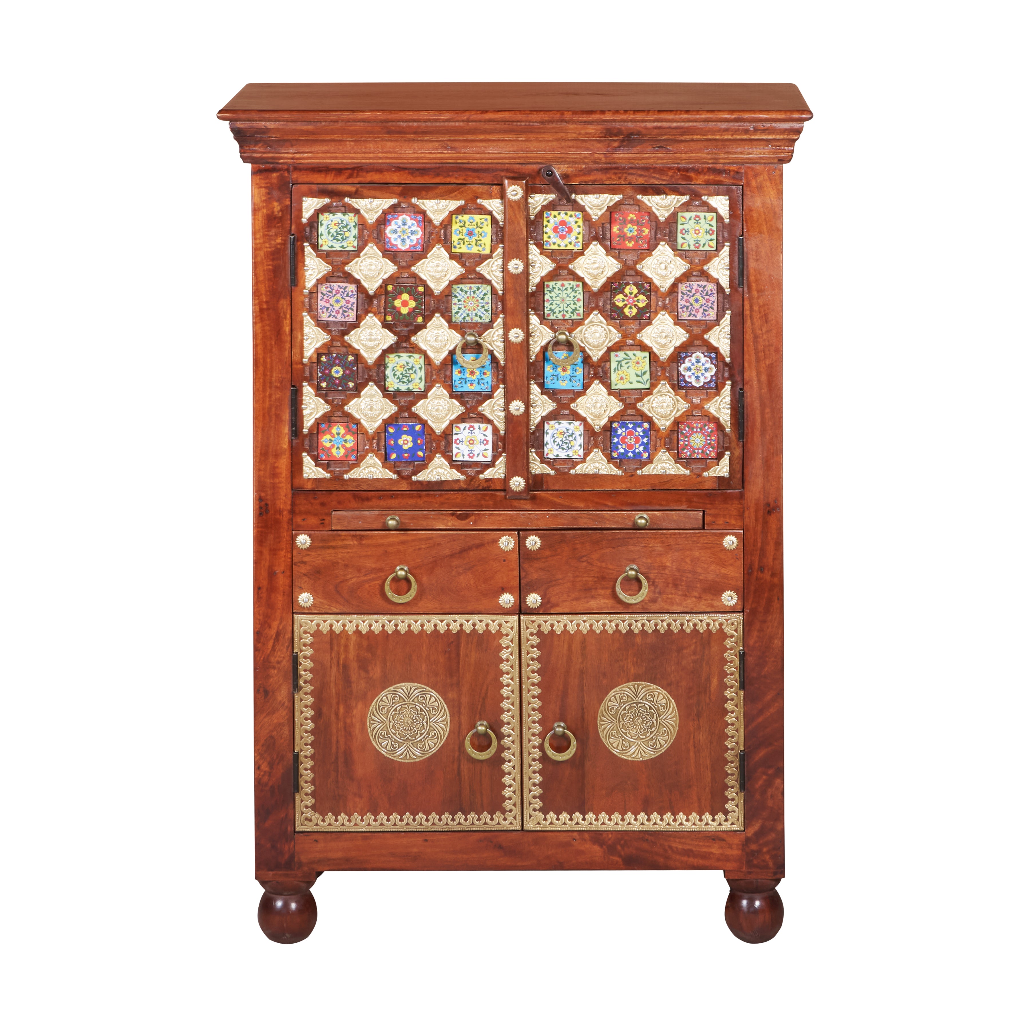 A hand-carved wooden mandir adorned with traditional tile fittings, creating a serene space for daily prayers and peaceful moments.