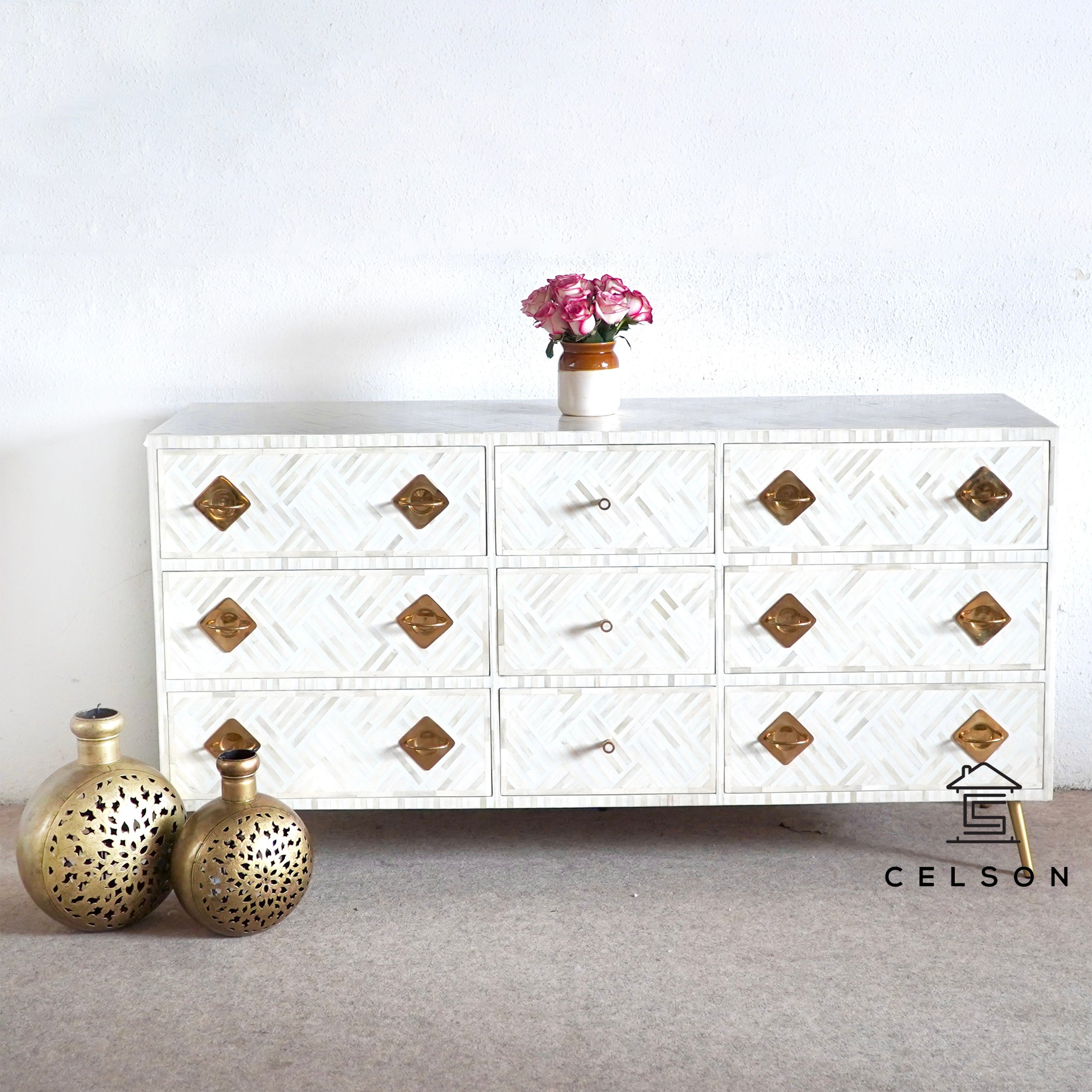 Elegance in storage! This white chest of drawers combines 9 spacious drawers, brass knobs, and golden legs to elevate your space.