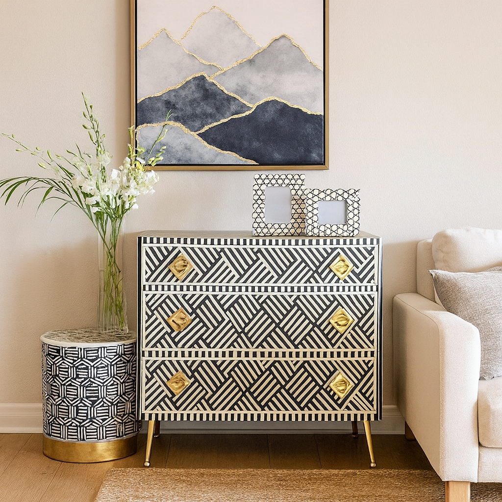 Set in a stripe pattern & a lovely black & White colour, this cabinet is a must have piece!