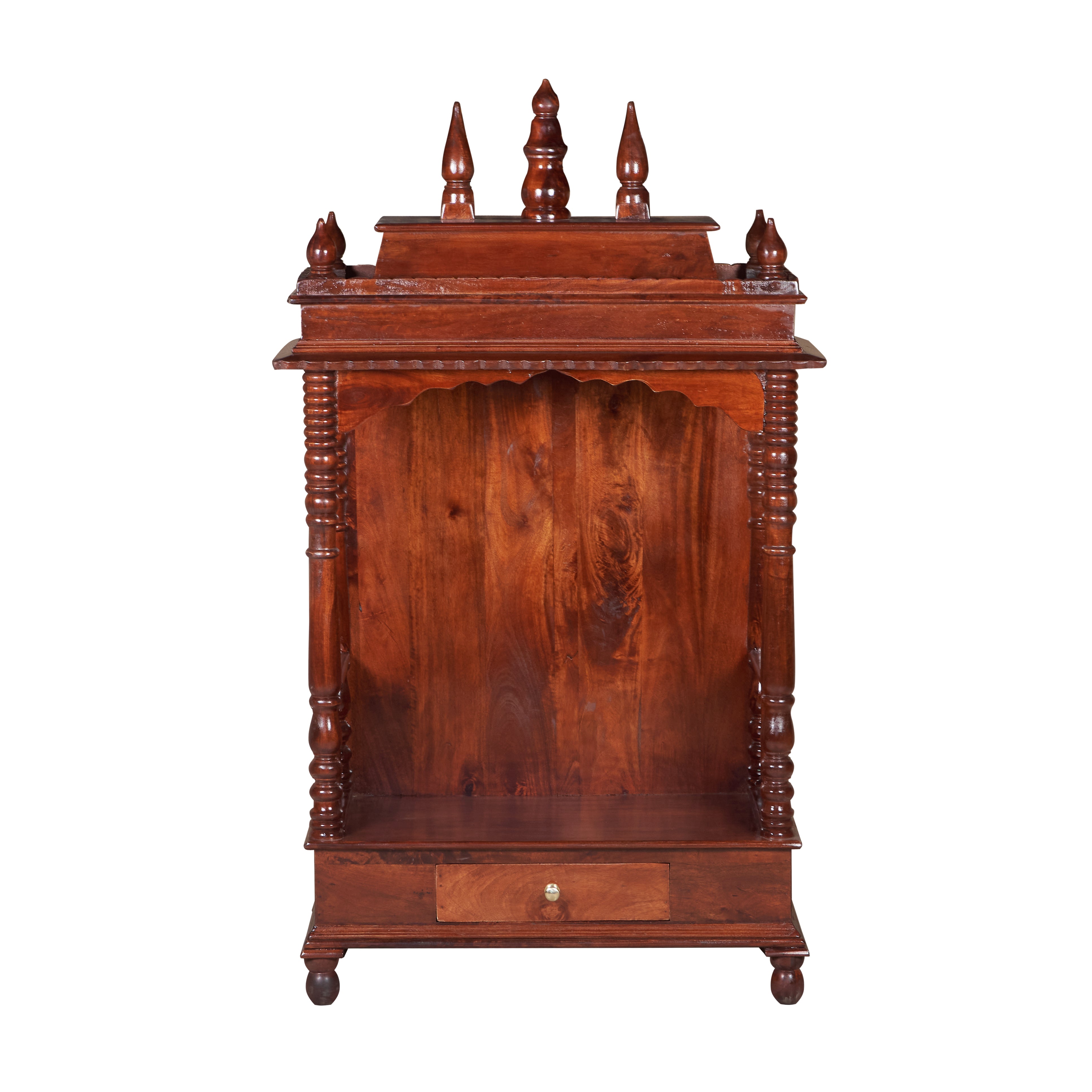 This hand-carved wooden Indian mandir allows you to sit on the floor and perform pooja in comfort and serenity.