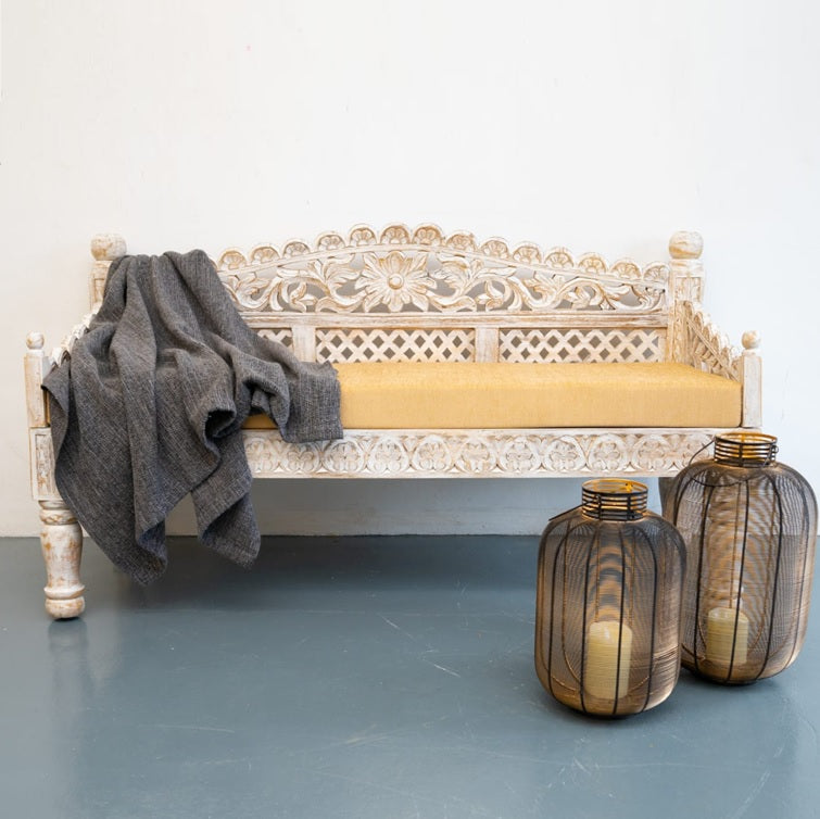 This piece comes with a fully hand carved exterior in a white washed finish & a complimenting cushion seat.