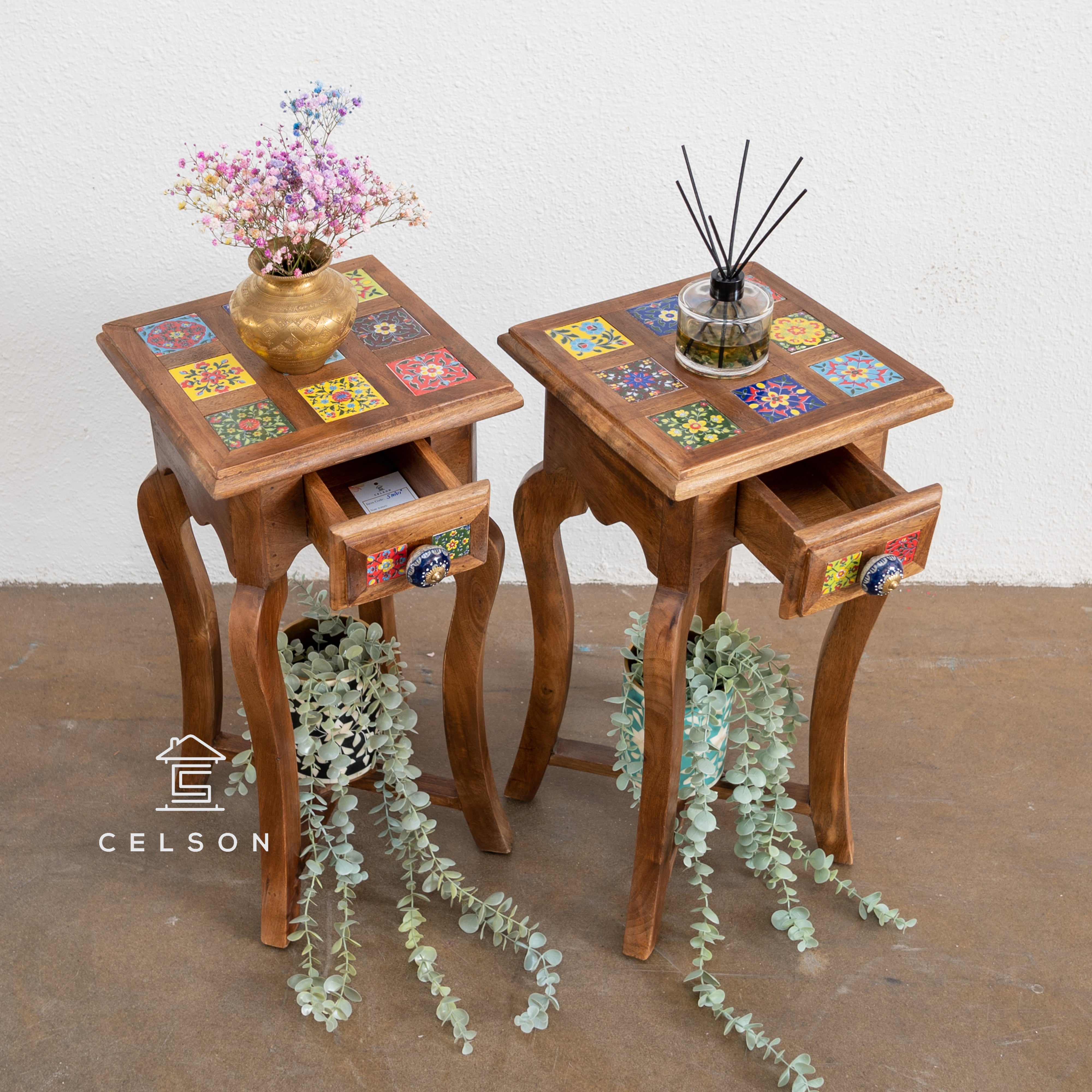 The combination of solid wooden body with multi color ceramic tiles top, these gorgeous curvy legs side tables are perfect for any home/decor.