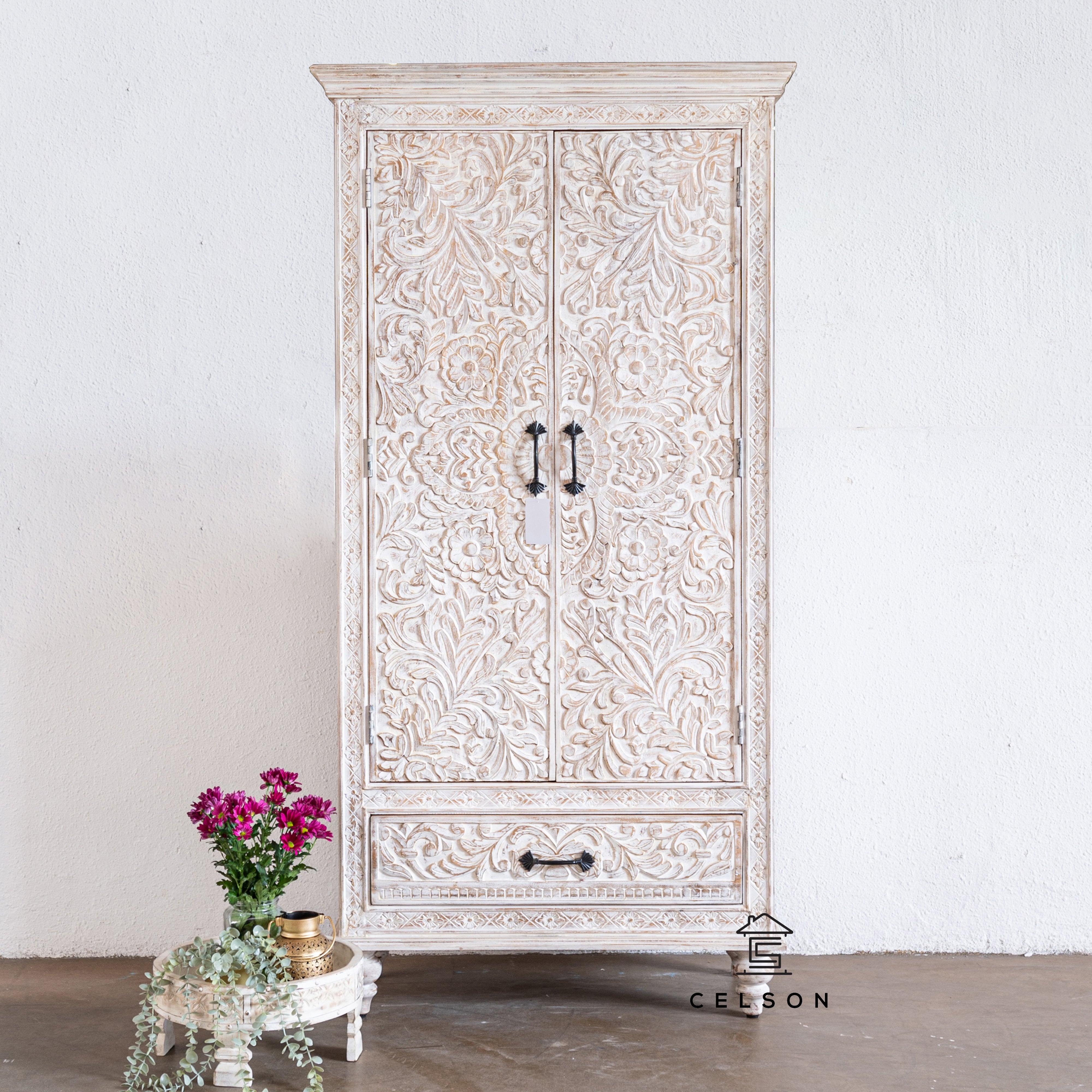 Our hand carved, distressed finish Kate tall cabinet can be a perfect cupboard. It has multiple shelves inside to neatly store all your clothes and a drawer at the bottom for all those shoes!!
