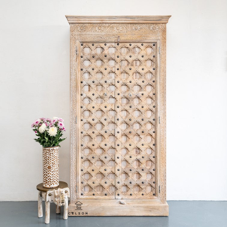 Our hand carved, white washed finish tall cabinet can be a perfect cupboard. It has multiple shelves inside to neatly store all your clothes.
