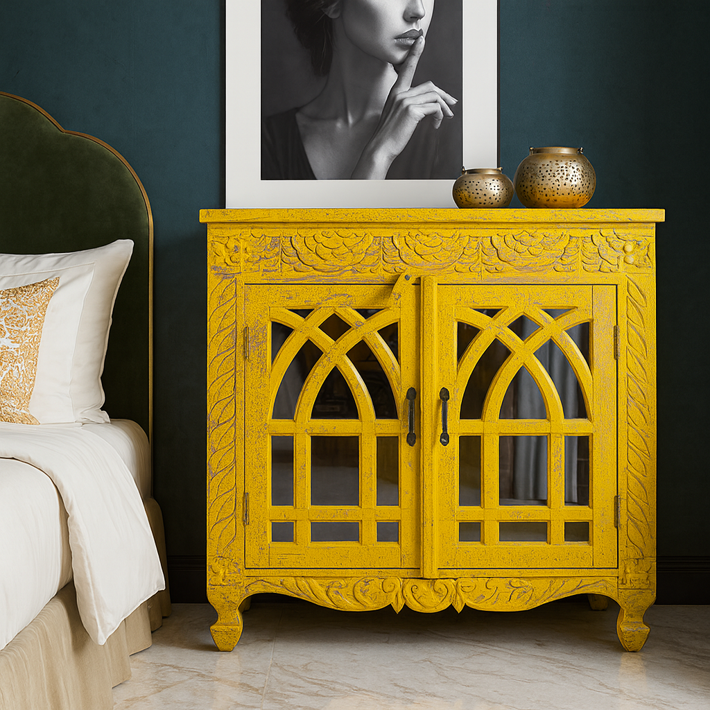 Set in a mirror with carved door & a lovely lemon colour, this cabinet is a must have piece!